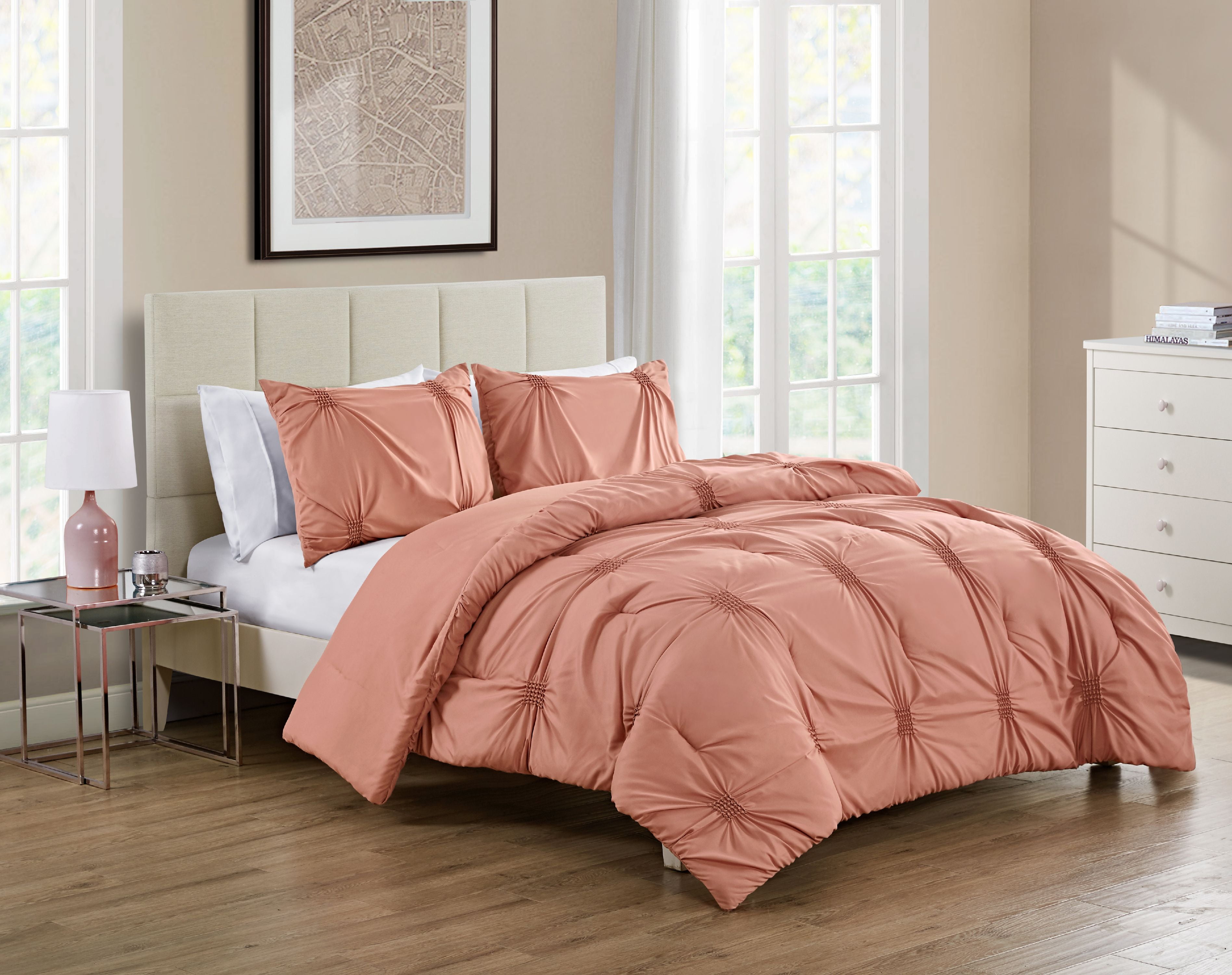 1 comforter and coordinating pintuck sham(s). Solid pure cotton face fabric in all over pintuck comforter & shams. The comforter set is designed to last while keeping you fashionable while still being inexpensive. Pintuck style, modern and fashionable. One(1) oversized comforter, one(1) bedskirt, two(2) euro shams, two(2) standard shams, one(1) decorative pillow and one(1) decorative square.